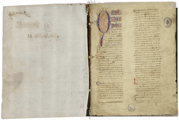 Primera página de manuscrito Almagesto de Clauido Ptolomeo traducido por Gerardo de Cremona entre 1201 y 1300. Fuente BNE